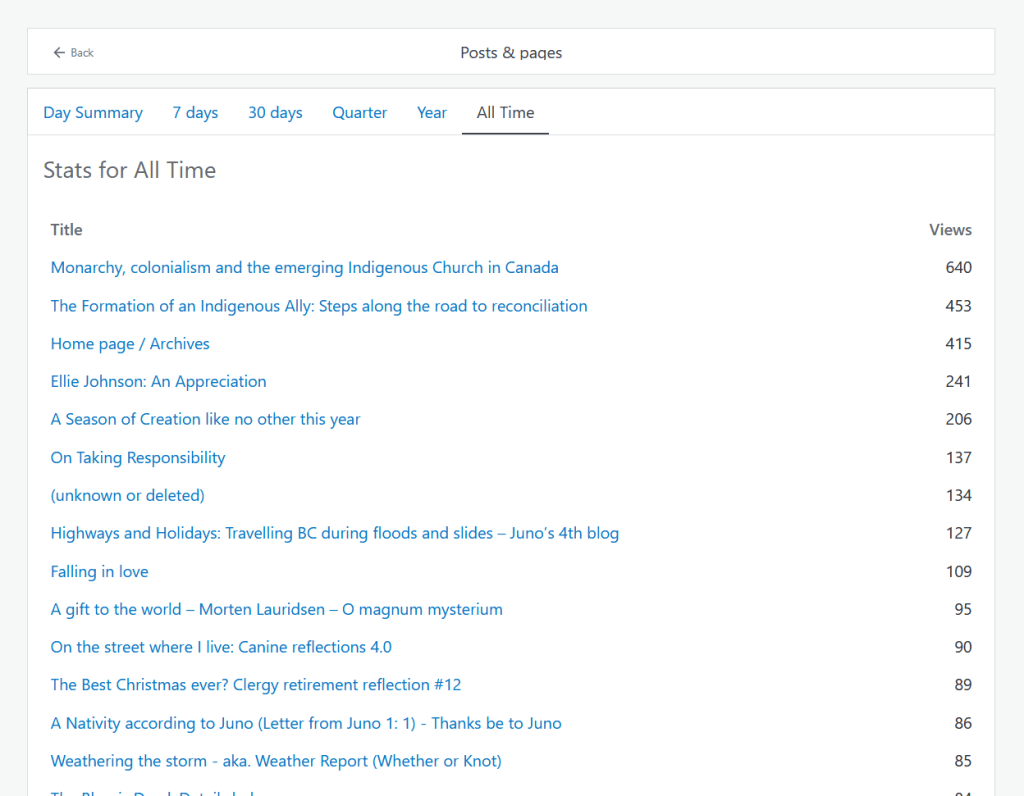 To date the blog has 25 regular followers; it would be nice to have 250 or 2,500 but I’ll take 25 stalwart readers any day. Take Note! will never go viral for a number of reasons: It’s too diverse in its interests; It does not intend to sell anything; The posts are on the long side (800-1000 words) – attention spans are short these days; I do not promote it beyond posting online and in social media; I do not study ways to increase traffic. Finally I am a writer of modest ability. I am waiting to “be discovered” knowing that recognition for J S Bach was only posthumous, though not for J K Rowling. (Neither of these however are or were bloggers.) I just love writing and given fewer sermon commitments these days I am grateful for a creative output destination. Popular blog posts in this series have included: