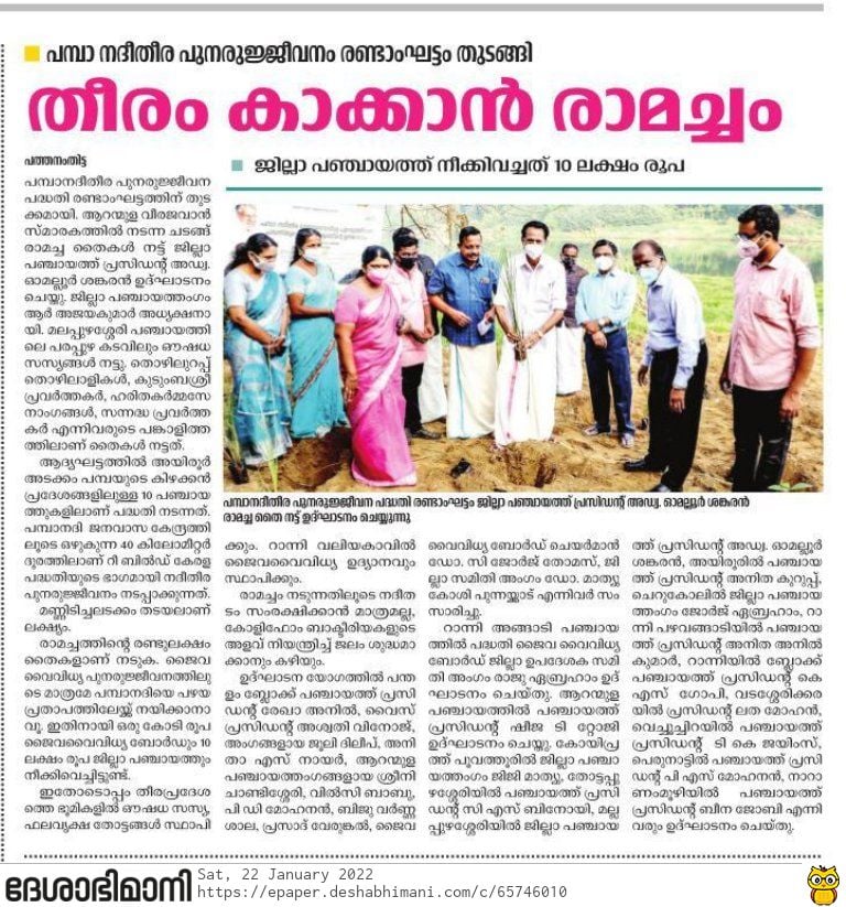 District Panchayat President inaugurated Vetiver planting on the Pampa river banks on the 21st of January 2022 under the auspices of the Kerala State Biodiversity Board and Pampa River rejuvenation project.