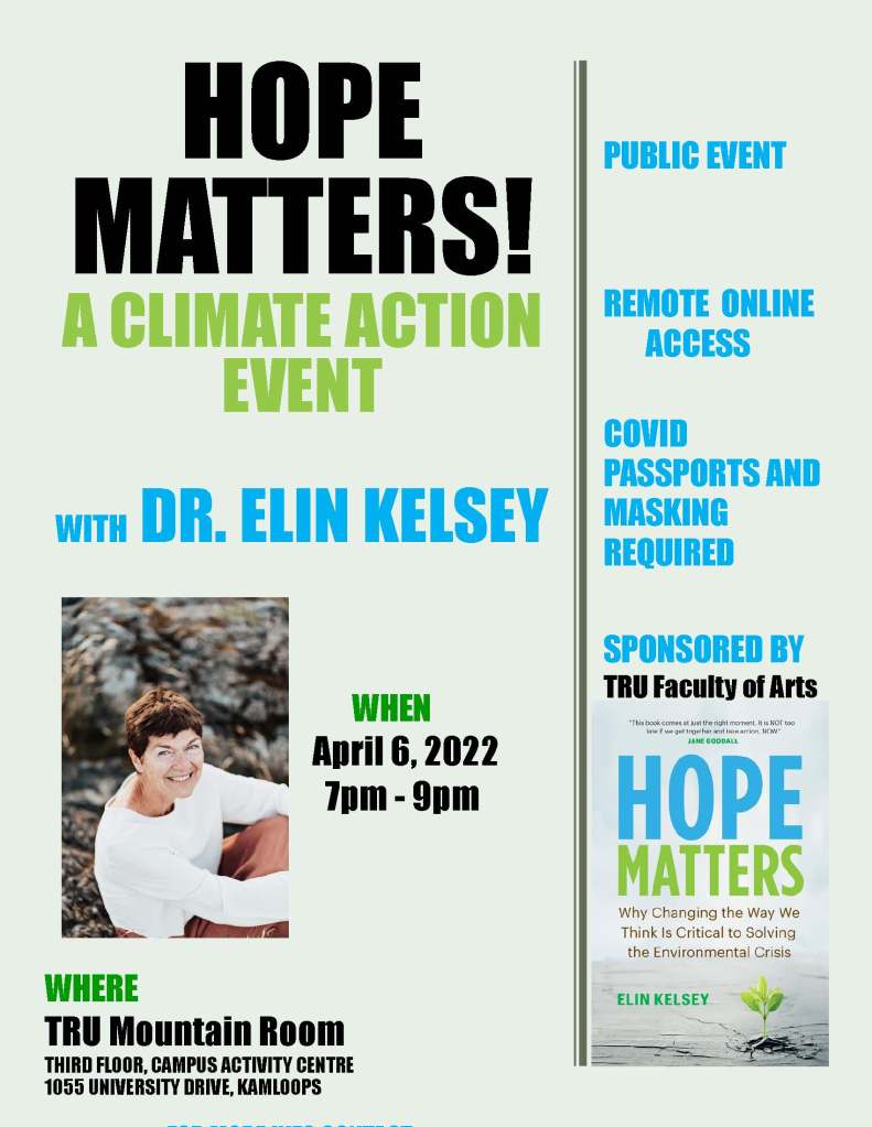 Dr. Kelsey’s guest lectures are sponsored by the TRU Faculty of Arts and are being offered as an experiential component of ENGL 4770 Pathways to Hope and Resilience. Students are exploring climate narratives through the lens of Kelsey’s 2020 publication Hope Matters: Why Changing the Way We Think Is Critical to Solving the Environmental Crisis. Her book is a truly inspiring as well as action-oriented approach to our future. In a recent interview with CBC Quirks and Quarks Elin explained: