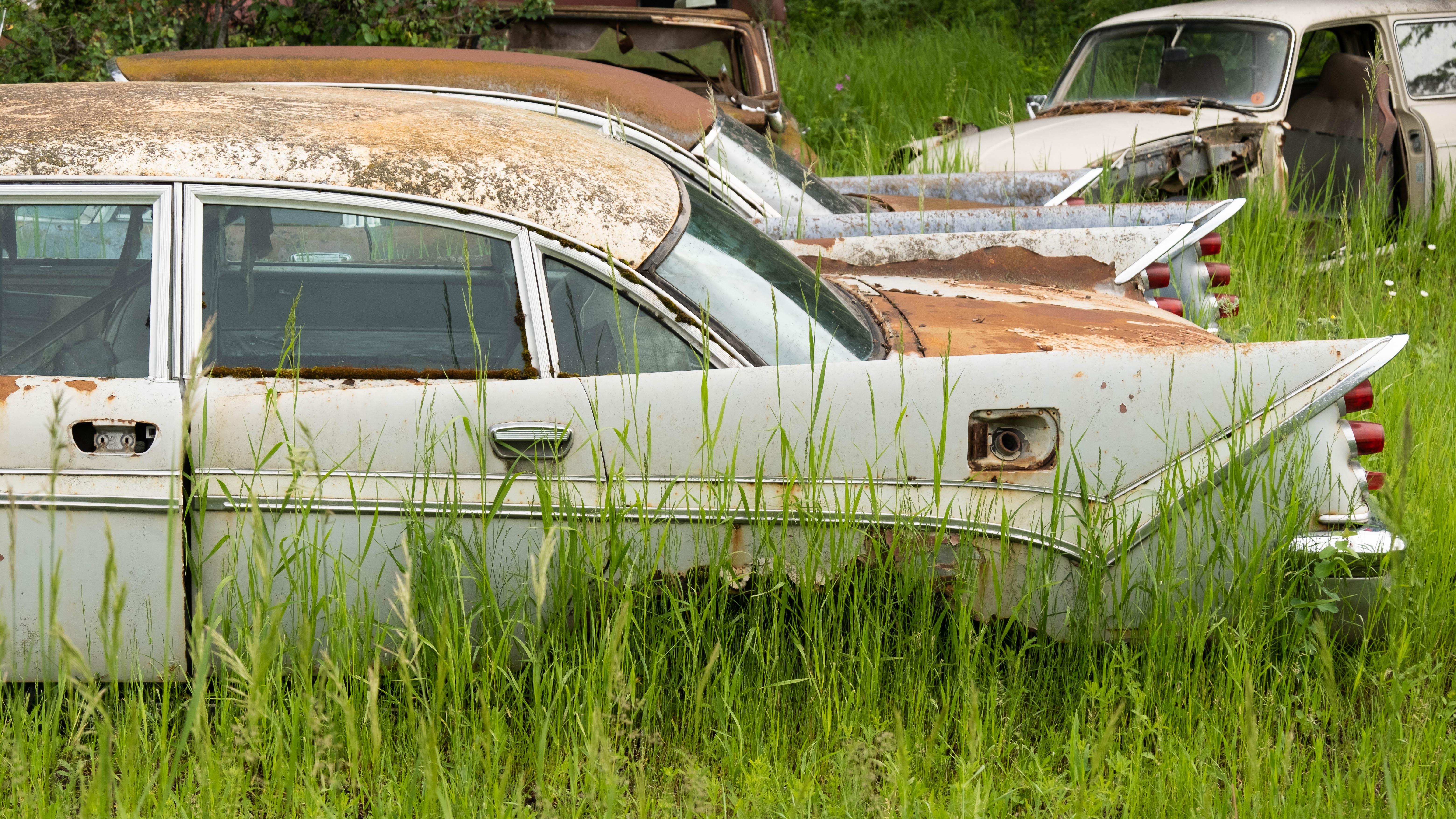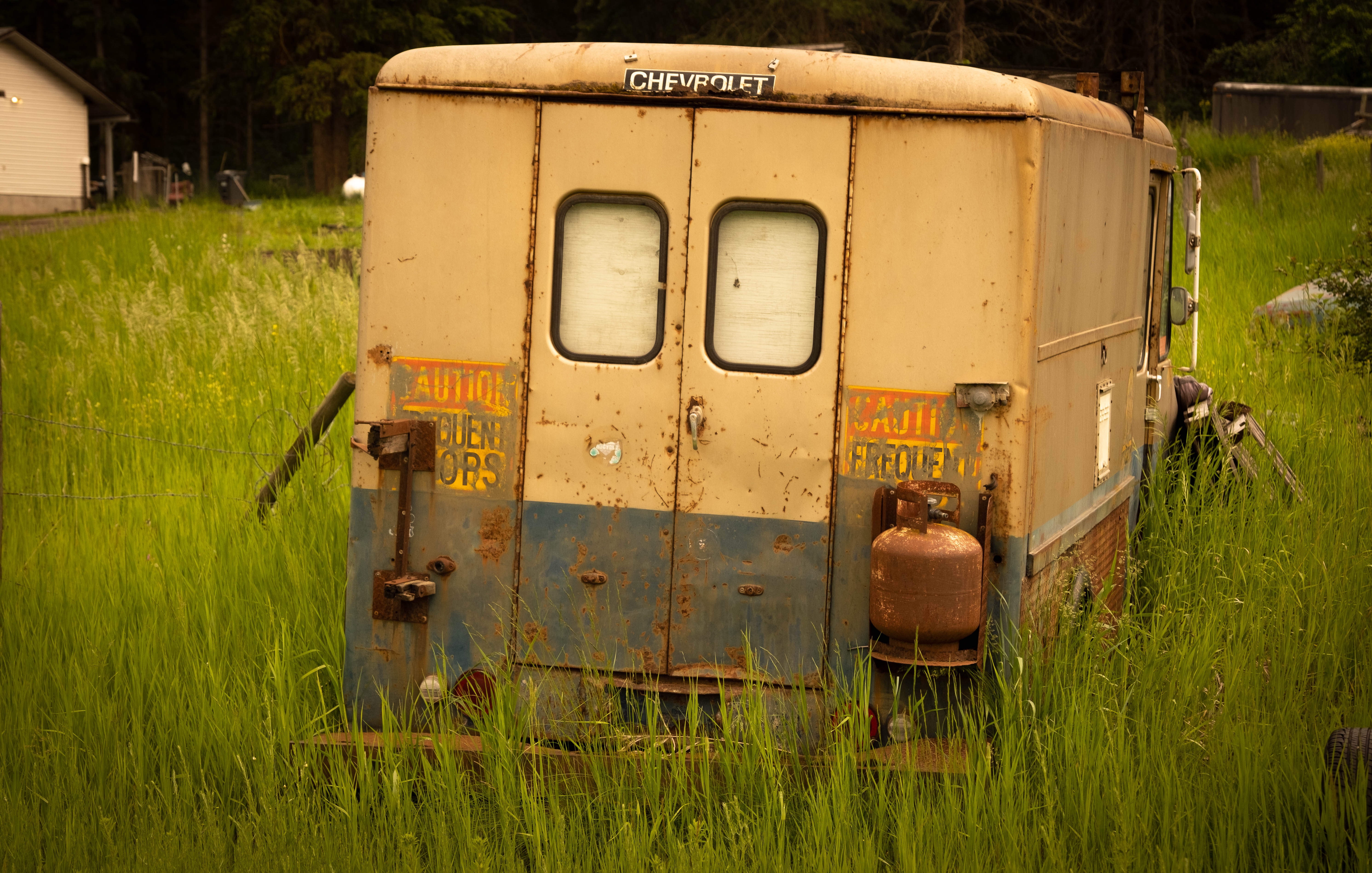 Sedans and coupes, luxury and service vehicles, arrayed in bright rusty colours, they are the remains of a golden age of automobile design and manufacturing. Similar vehicles often displayed in Show and Shine events in local cities, these vehicles are sadly neglected, too costly to restore, or simply too much work to revitalize. In larger centres, they would have saleable parts stripped away and the remains compressed into scrap metal due for export abroad. These mementos from the years 1955-75 simply rest and rot, nestled amongst the greenest Spring grass and flashing Wild Mustard flowers this region has seen for decades.