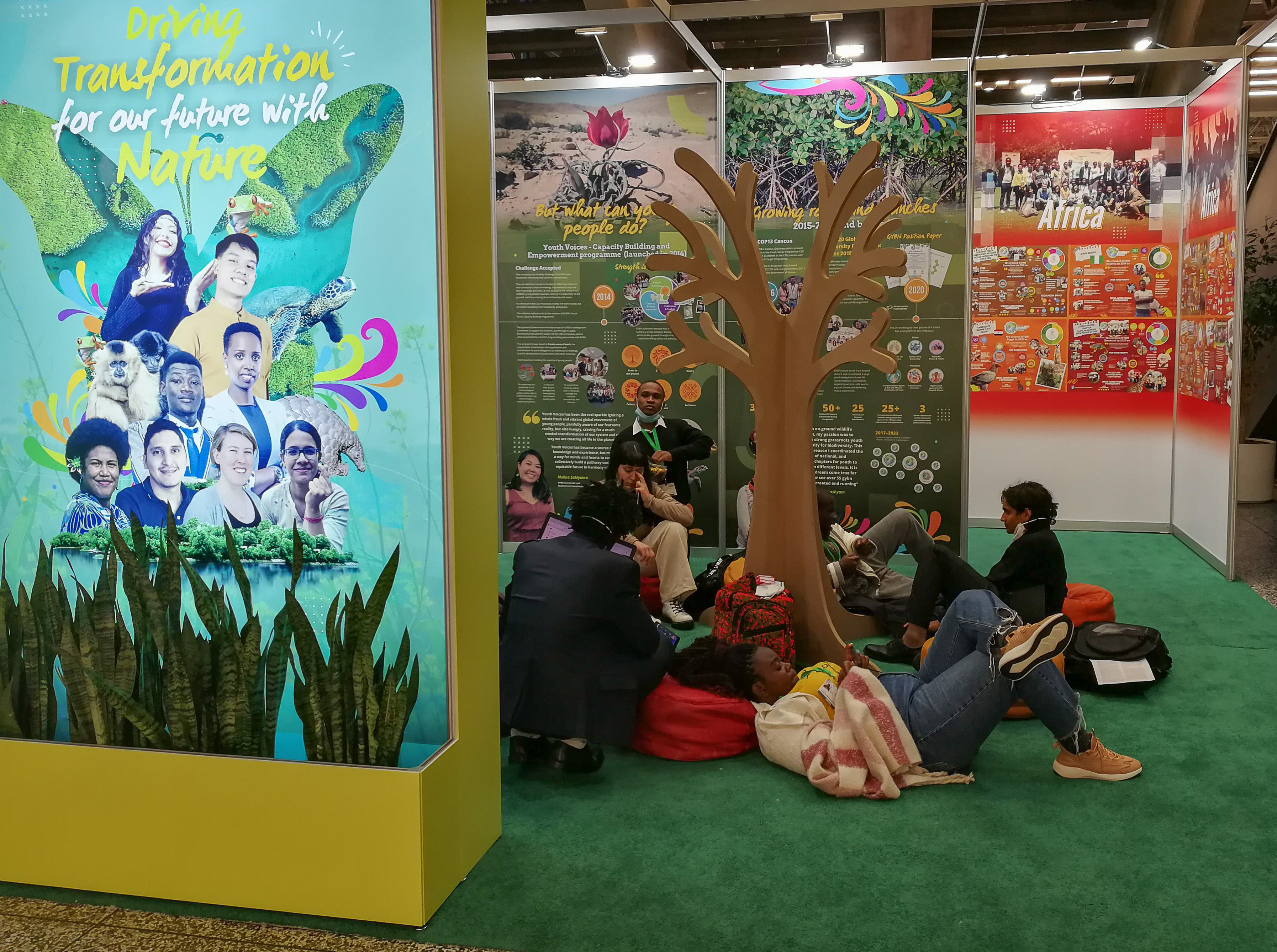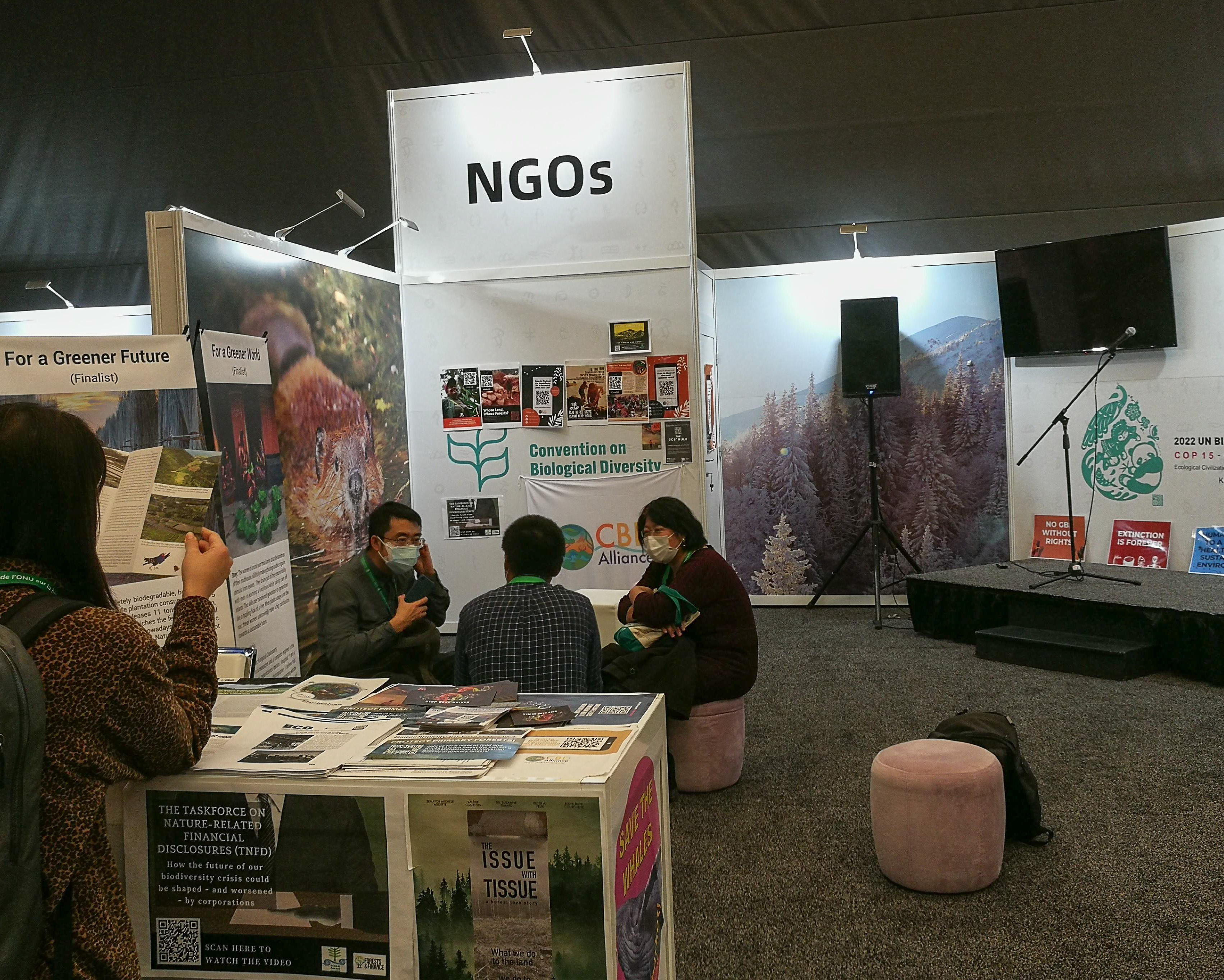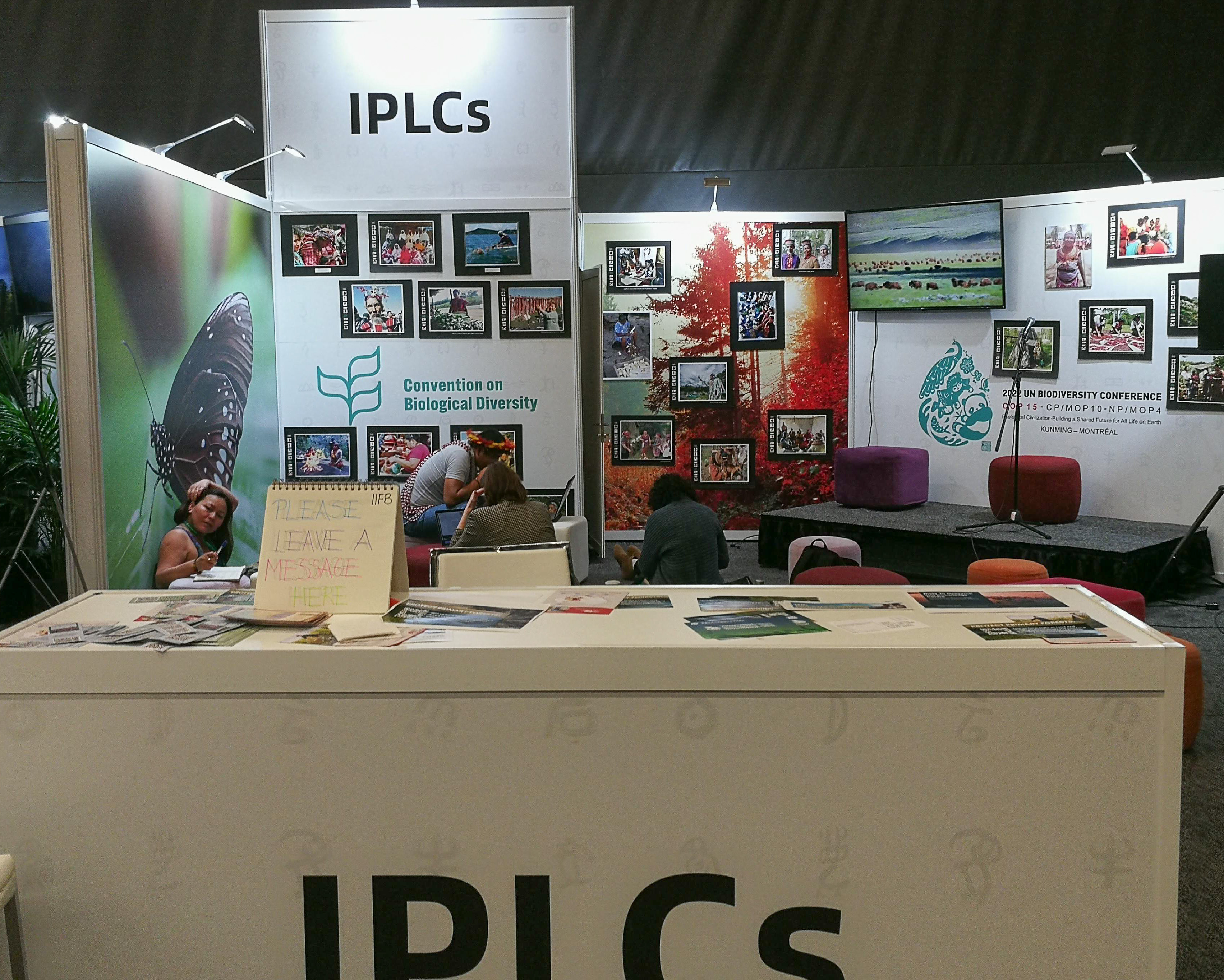 The Faith-based kiosk was located in the general space housing Business and Finance, Women, Youth, NGOs, United Nations, Academia and Research lPLCs (Indigenous Peoples and Local Communities). There are discrete sitting areas for people and a stage and a display counter with storage space beneath for coats, bags…