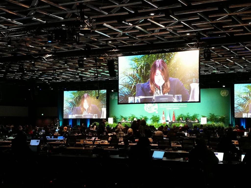 Everywhere there is colour. Posters and electronic billboards “advertising” countries, cities, organizations, animals, plants, side-events, press conferences… every and anything that can be displayed – and above it all, the low background buzz of people talking. All this before we even get to the Conference Rooms upstairs where the hard negotiations are on-going.
