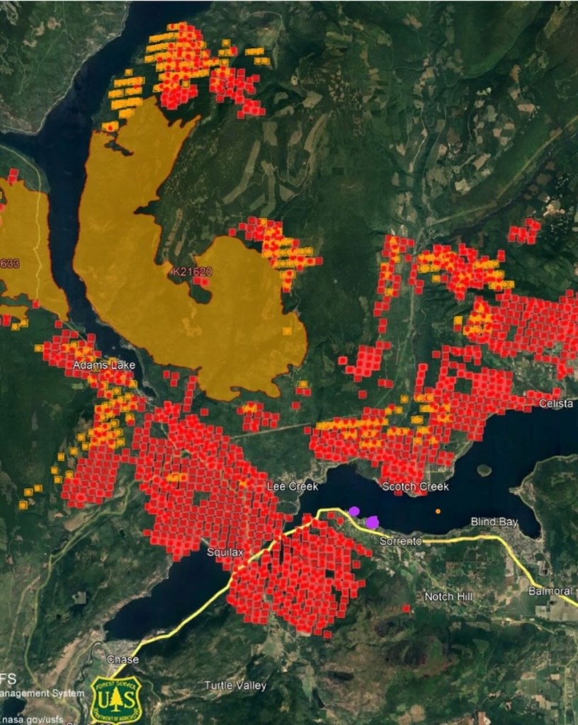 With everyone safe and sound, we awoke Saturday to the news that the fire continues to press from the south and west. The red on the attached map, which was released by BC Wildfire Service, shows the fire at around 11 am. The two purple dots are our Centre and farm. By early afternoon, the evacuation orders were expanded around Sorrento, and other nearby communities were put on alert. The TransCanada Highway between our Centre and Chase has been closed due to fires.