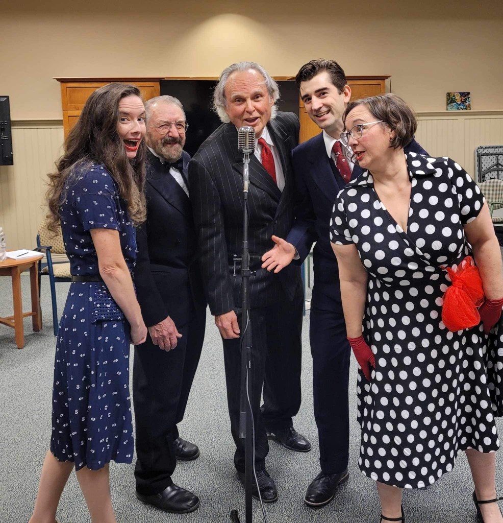 We begin with the script familiar to many through the 1946 movie starring Jimmy Stewart and Donna Reed, directed by Frank Capra. We change things up however, as what the audience will actually see is a radio production at a fictional New York station, a production akin to those radio plays produced through the 1950s to the 1980s throughout North America. (I remember hearing many of these during the last half-hour of Peter Gzowski’s Morningside on CBC Radio.) Theatre-goers will watch live actors re-creating for radio listeners an audio track, with performers each portraying multiple characters, supported by live sound effects, and for my part, incidental music including advertising jingles. Same content—different presentation.