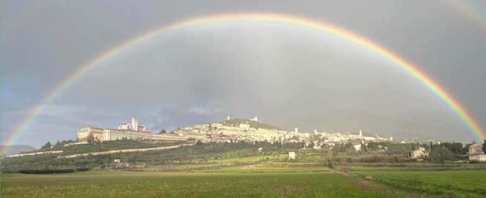 In the footsteps of Saint Francis, over a hundred delegates from all continents gathered in the Cittadella Laudato Si’ conference centre, with a sizable group of online participants (including yours truly) connecting remotely. As delegates arrived in Assisi, (including Canadians Maylanne Maybee and Marion Lucas-Jeffries) they were offered a memorable gift: a glorious rainbow, a reminder of Noah’s Covenant: “when the bow appears in the clouds, I will see it and remember the everlasting covenant between God and every living creature” (Genesis 9:16).