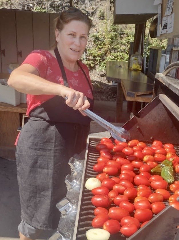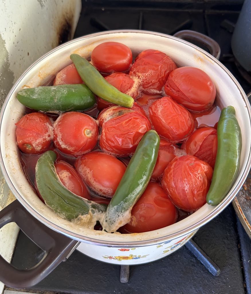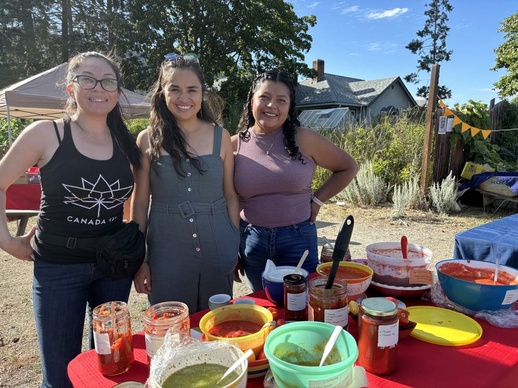 On the day of the salsa garden party, there was much sizzling and roasting, boiling and blending at the Carcajou Fruit summer kitchen. The three amigas who made the salsa were in their element. I learned that they are very adept at producing large quantities of food to share with their community. In Mexico they have numerous celebrations throughout the year where the neighbours come together by the hundreds to share a meal. Our block party was a small gig for this crew.