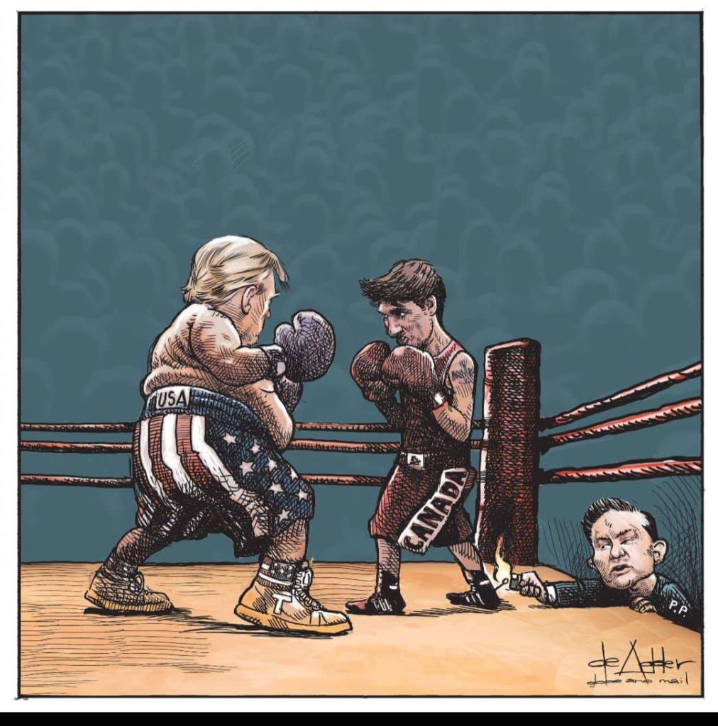 1. His worst enemy he faces is his Sharpie. He can’t take low approval ratings. He has no patience for anything that takes longer than putting together his Family Meal. He inflicts pain but can’t handle any himself. Girding our loins and being united in letting his adolescent self be the ultimate villain will build strength here at home while letting those 25% tariffs work their magic to bite him in the ass. That man is about to learn what happens once ‘O Canada’ has played and the puck has hit the ice.