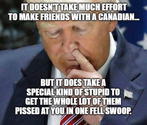 We don’t have a flag to fly on our patio today; other Canadians however certainly do. It’s refreshing that many Canadians have recovered their pride in our 60-year-old Maple Leaf Canadian flag, itself recently dishonored by trucker convoys and hootenanny right-wingers. Instead of parading the flag on our south-facing patio, I offer the memes below as an in-your-face tRump salute. Enjoy friends. Oh Canada! It’s the First of July in the middle of February.