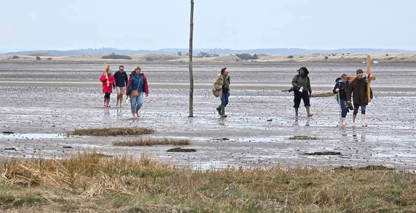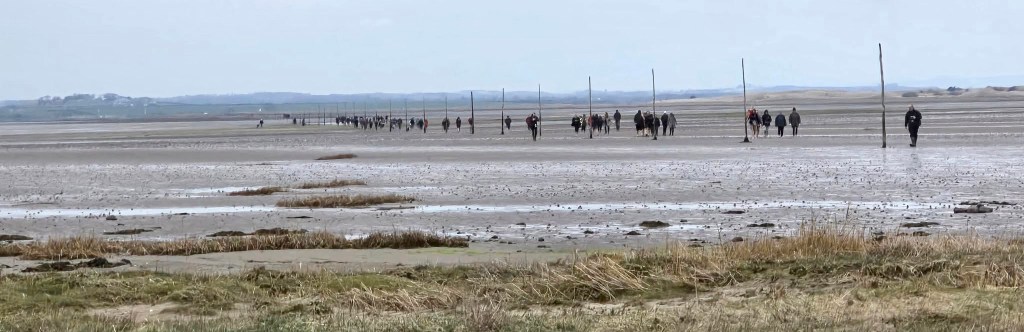 Watching with fond memories of my own crossing I was delighted to discover on my morning social media feed today images from this year’s 2025 crossing; pilgrims walking the ancient “Pilgrim’s Way” marked out by guide poles during low tide (read the tables carefully island residents strenuously advise). By tradition, pilgrims carry large crosses just as we carried ours all the way from Penrith. The tradition, it seems, continues. An additional thrill was being filmed and for broadcast on the BBC evening news. A still image made it on to the front page of the Easter morning Scotsman newspaper.