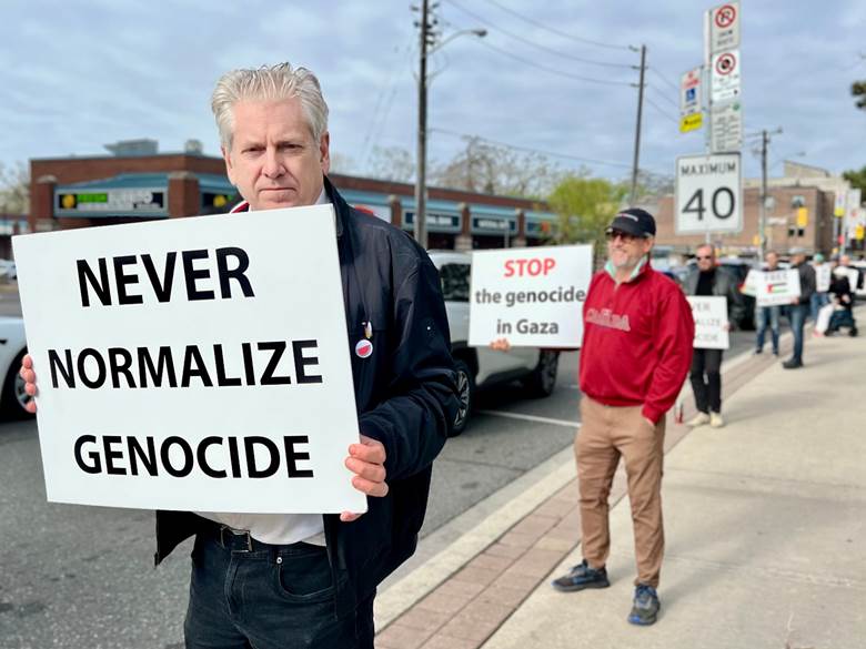 I have written before about Ted and his decision to stand out on the corner of Toronto’s Kingston Road and Victoria Park every Thursday morning with a simple sign that reads: “Never Normalize Genocide.”