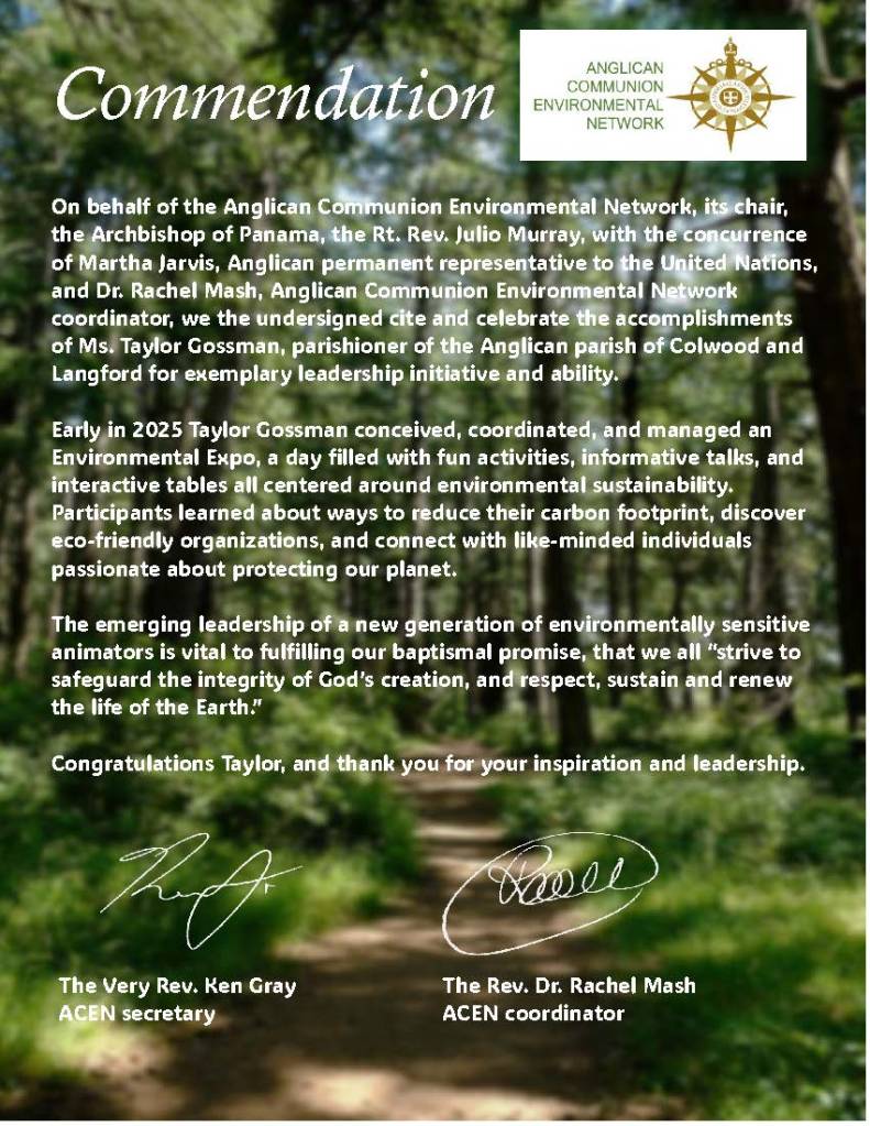 On behalf of the Anglican Communion Environmental Network, its chair, the Archbishop of Panama, the Rt. Rev. Julio Murray, with the concurrence of Martha Jarvis, Anglican permanent representative to the United Nations, and Dr. Rachel Mash, Anglican Communion Environmental Network coordinator, we the undersigned cite and celebrate the accomplishments of Ms. Taylor Gossman, parishioner of the Anglican parish of Colwood and Langford for exemplary leadership initiative and ability.