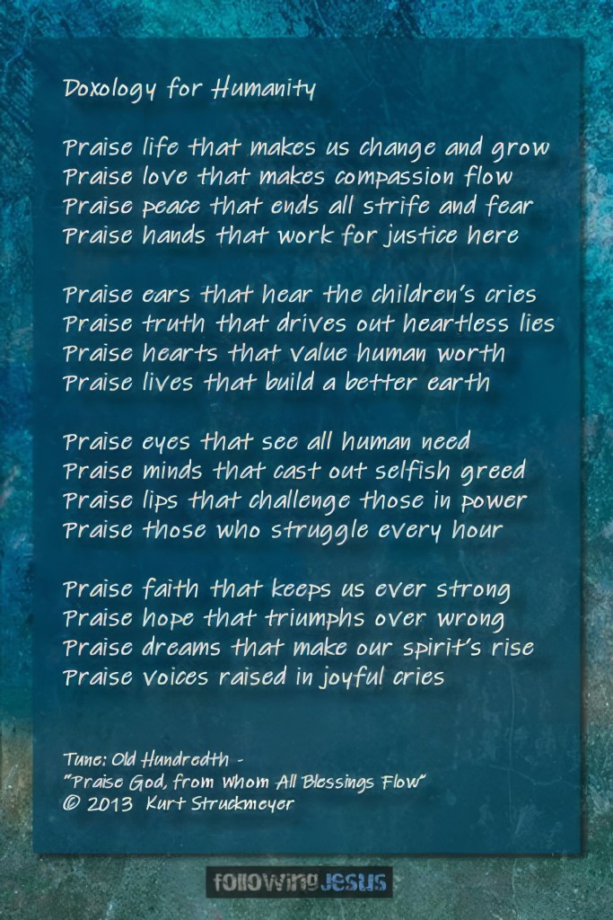 Some congregations and families are starting to use my “Doxology for Humanity” when lighting their Advent candles during the season of Advent. They are using one verse each Sunday.